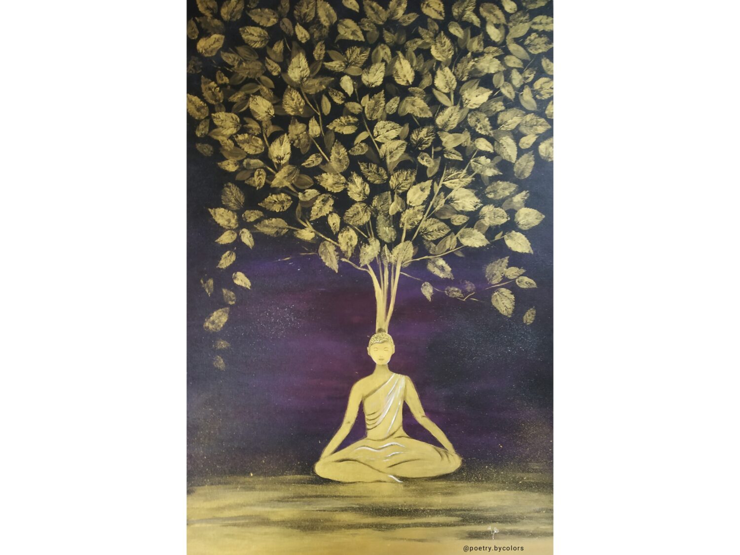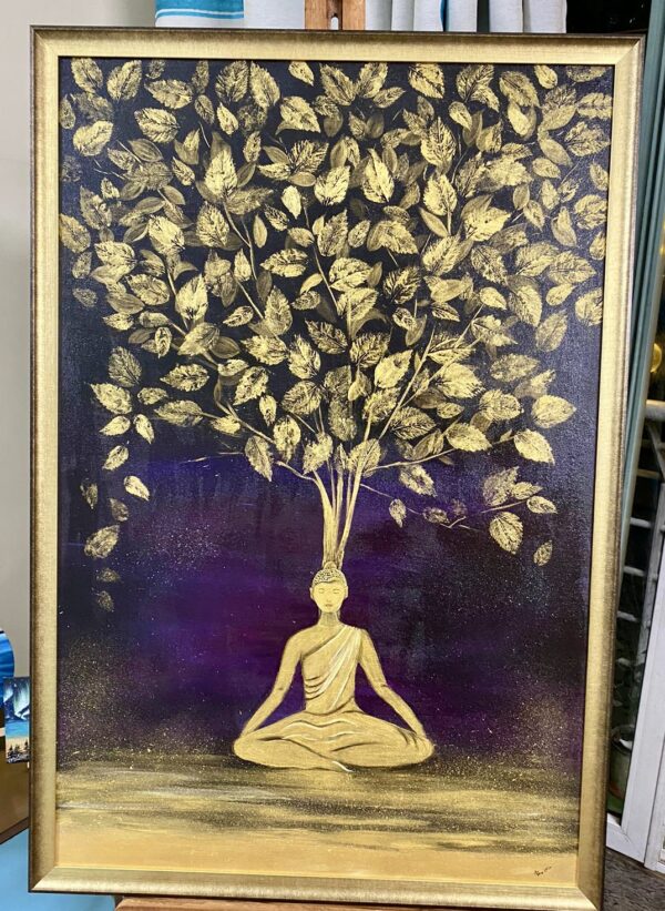 Inspired by the Buddha and the tree of enlightenment, this painting is adored with vibrant gold on a classy background.