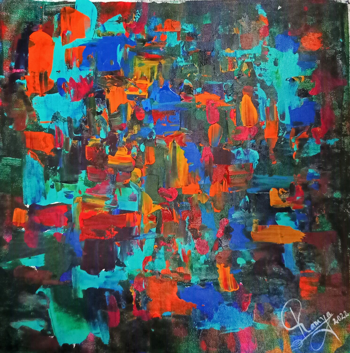 These colourful paints get me excited and my creative abilities/ juices spill onto the canvas to form a vision/ glimpse of the emotional experience what I went through to create the artwork.My distinctive personal style emanates feelings of joy , peace and express the vibrance of our human spirit.
