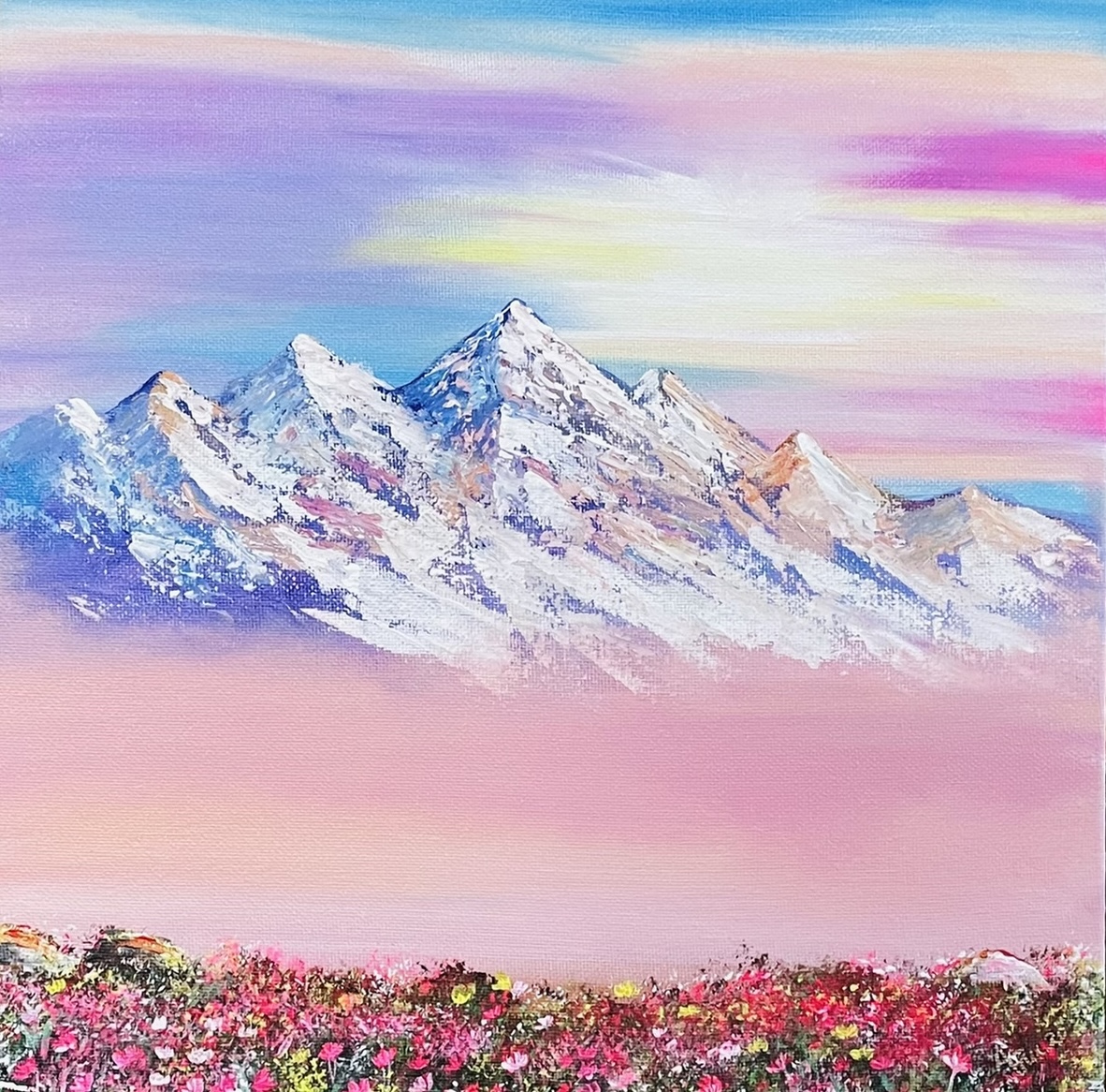 This pastel beauty is inspired by dreamy sunsets I chased during my visit to Sikkim. The reflection of sky on snowy peaks are a bliss to watch. Bringing the positive vibes of Kanchenjunga to home was my inspiration for this art.