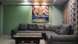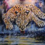 Large sized wildlife work, the strokes in painting are very much in tune with the restless nature of the beautiful animal. Life sized work with splashes of water makes it more interesting.