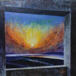 This artwork is very special and close to my heart. The setting sun painted in a different an artistic style. The perspective of window makes it realistic while the textured artwork gives it an unique flavor which is unmatched with realistic painting. Landscape in twilight with streetlights at distance makes it more mysterious.