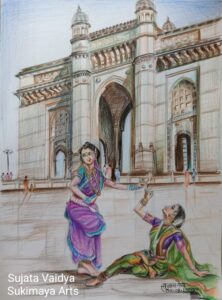 This painting is the 5th painting of the exclusive ‘Art and Architecture’ collection of Indian different dance forms with their sculpture and different styles of Architecture. This symbolic painting brings synergy between the dance form ‘Lavani’ and the monument of Mumbai – the land of dreams.